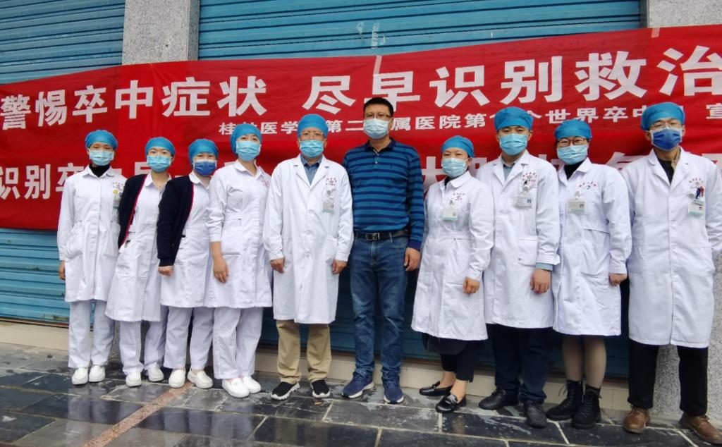 10月29日上午,桂林医学院第二附属医院脑血管病科联合综合内科、康复医学科医护人员在临桂区两江镇政府广场门前开展“世界卒中日”义诊活动。活动中,脑血管病科、综合内科、康复医学科各位医护人员针对脑卒中防治、康复知识进行详细讲解,为百余名群众测量血压、血糖,发放健康宣传手册,并进行健康知识宣教,传达健康理念及健康生活方式,警惕卒中症状,尽早识别救治,并为部分群众进行用药指导。义诊活动切实提高广大群众对脑卒中防治重要性的认识,得到了当地群众的一致好评!